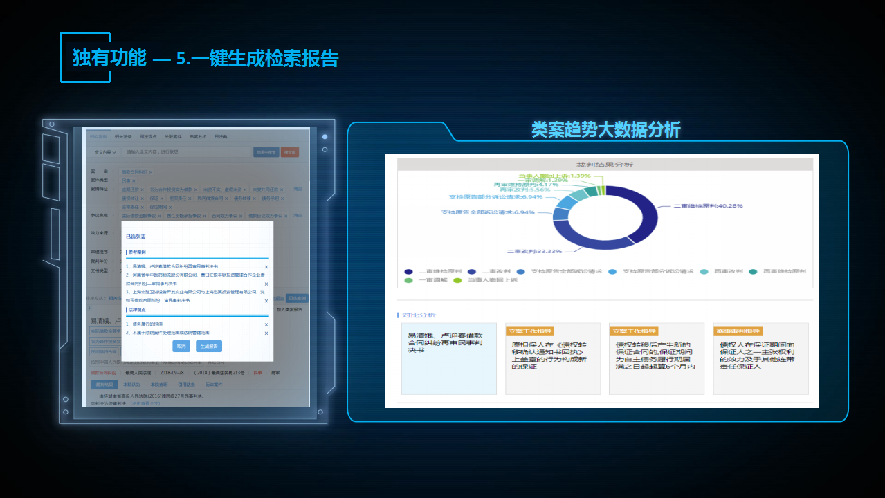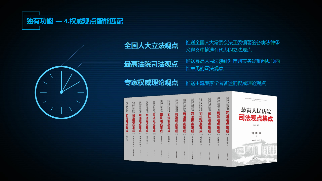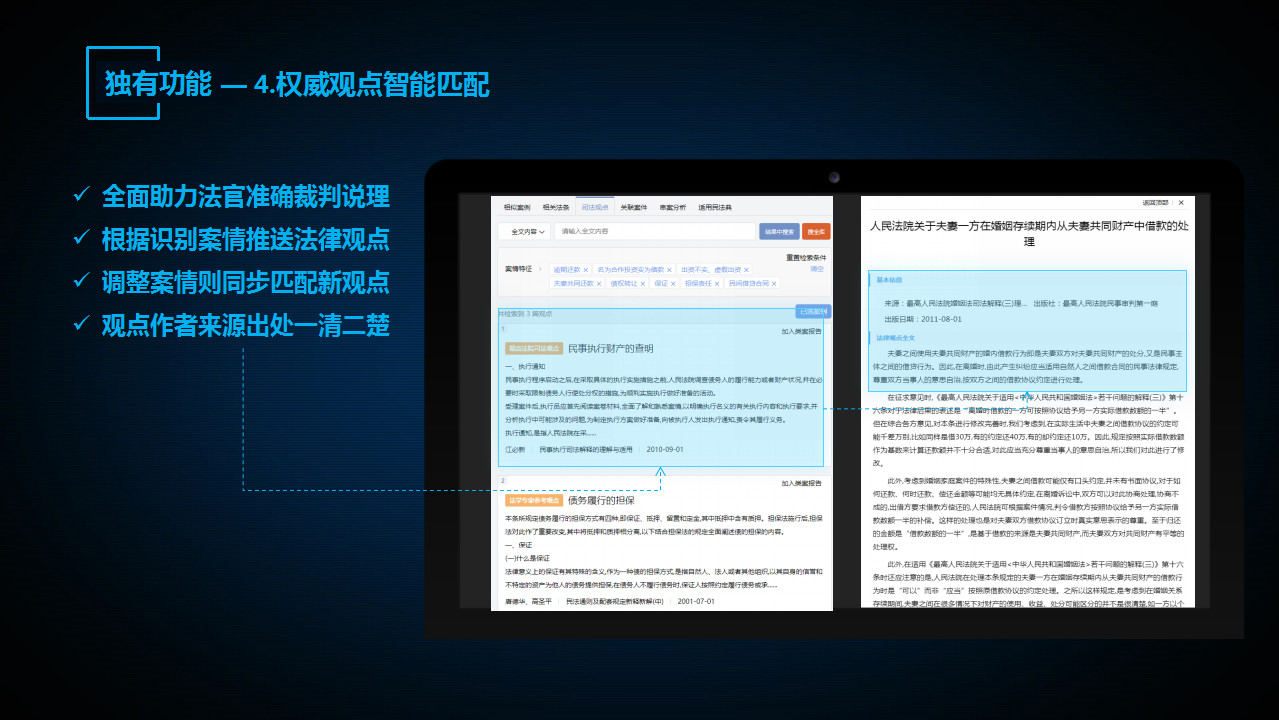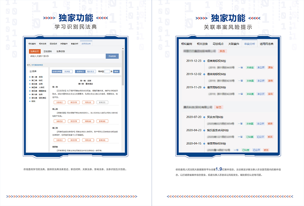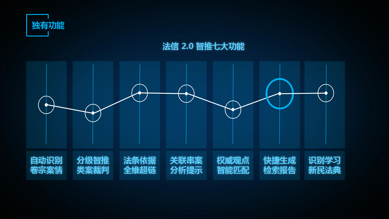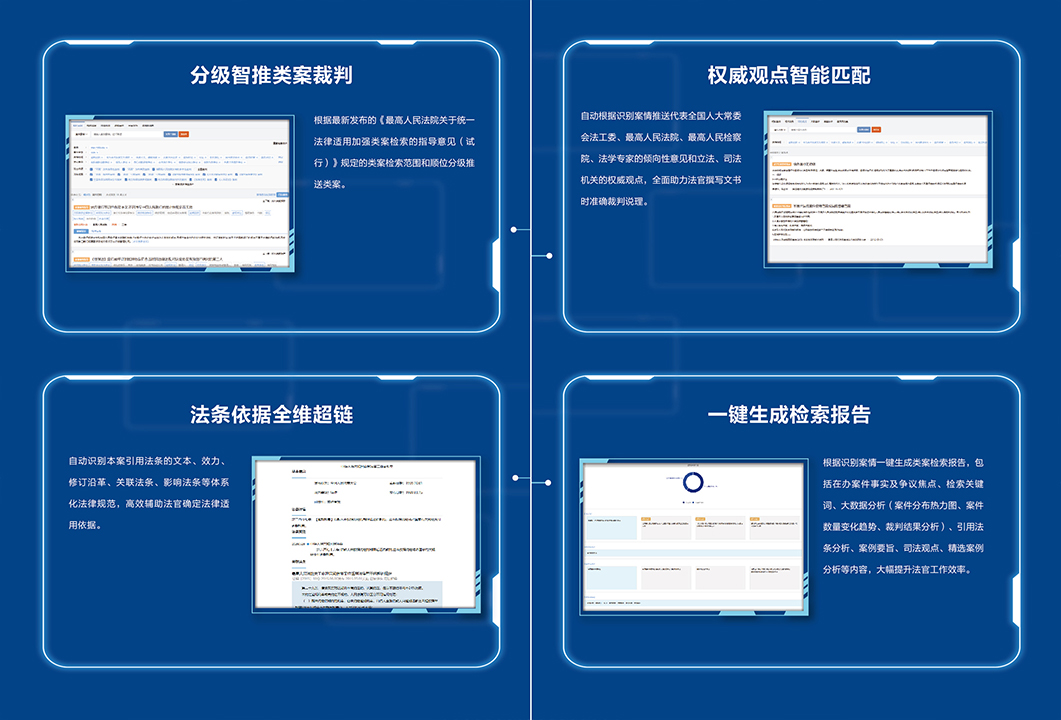 “法信2.0智推系統(tǒng)”高度集約化七大核心功能。包括:自動(dòng)識(shí)別卷宗案情、分級(jí)智推類案裁判、法條依據(jù)全維超鏈、關(guān)聯(lián)串案分析提示、權(quán)威觀點(diǎn)智能匹配、快捷生成檢索報(bào)告、識(shí)別學(xué)習(xí)新民法典。