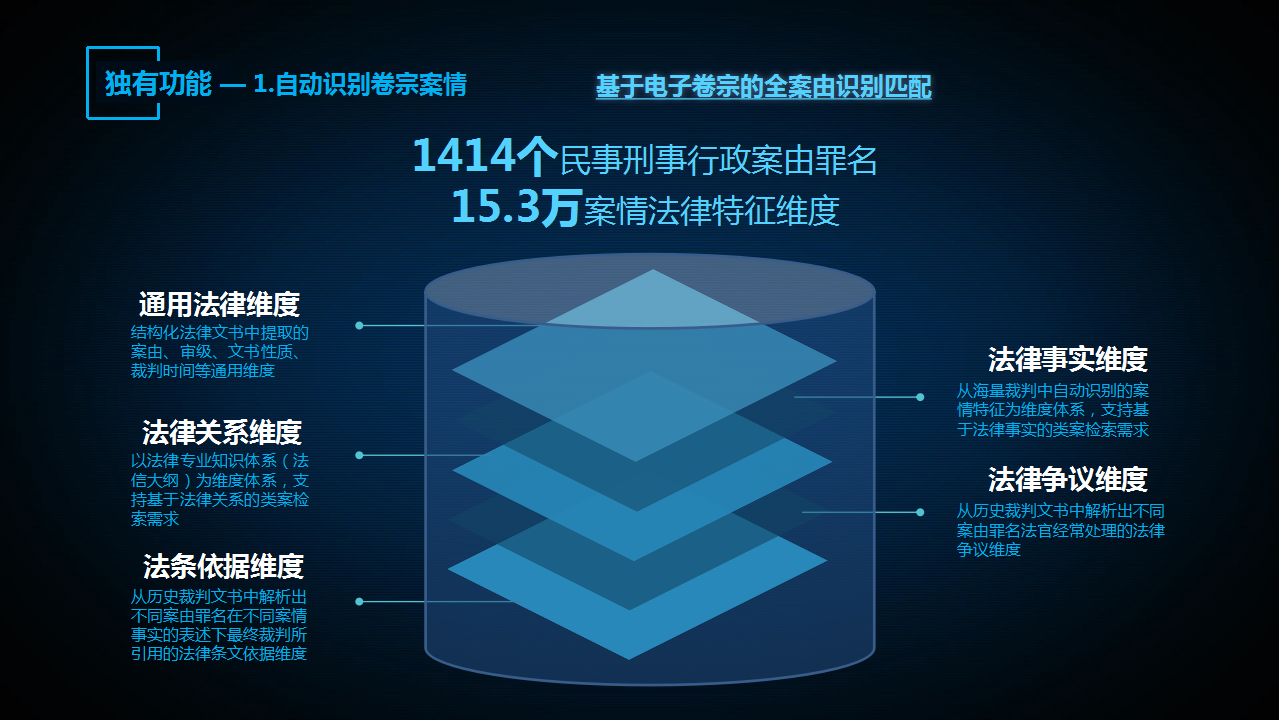 “法信2.0智推系統(tǒng)”的核心功能是實(shí)現(xiàn)基于個(gè)案電子卷宗的全案由識(shí)別匹配。這是系統(tǒng)最核心的技術(shù)能力,實(shí)現(xiàn)了法律關(guān)系、法律事實(shí)、法律爭(zhēng)議、法條依據(jù)和通用法律屬性多達(dá)5層維度的體系化融合,進(jìn)而完成了對(duì)1414個(gè)案由罪名,總量達(dá)15.3萬的法律維度體系的搭建。