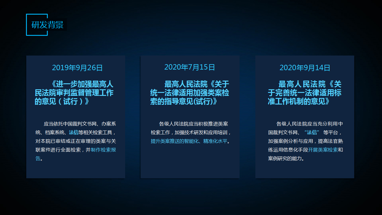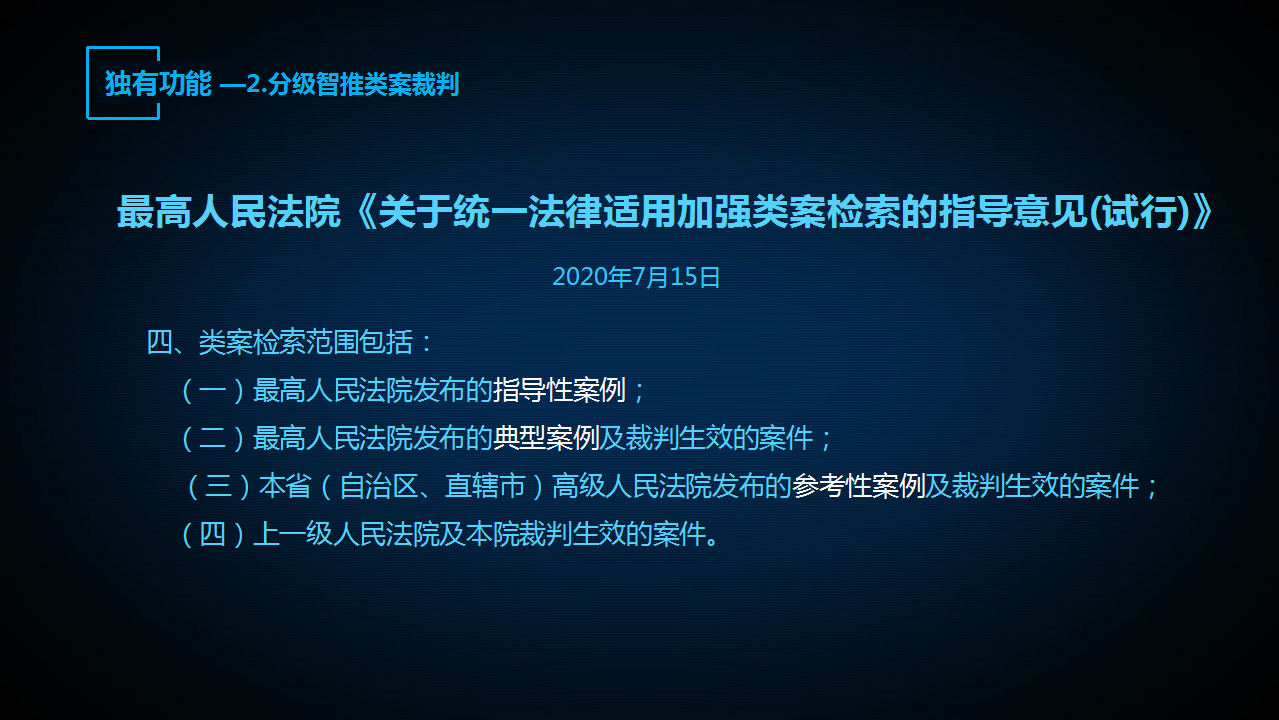特別是今年先后下發(fā)了《關(guān)于統(tǒng)一法律適用加強(qiáng)類案檢索的指導(dǎo)意見》《關(guān)于完善統(tǒng)一法律適用標(biāo)準(zhǔn)工作機(jī)制的意見》,在這些文件中都對(duì)利用信息化手段提升類案推送的智能化、精準(zhǔn)化水平提出了明確要求。