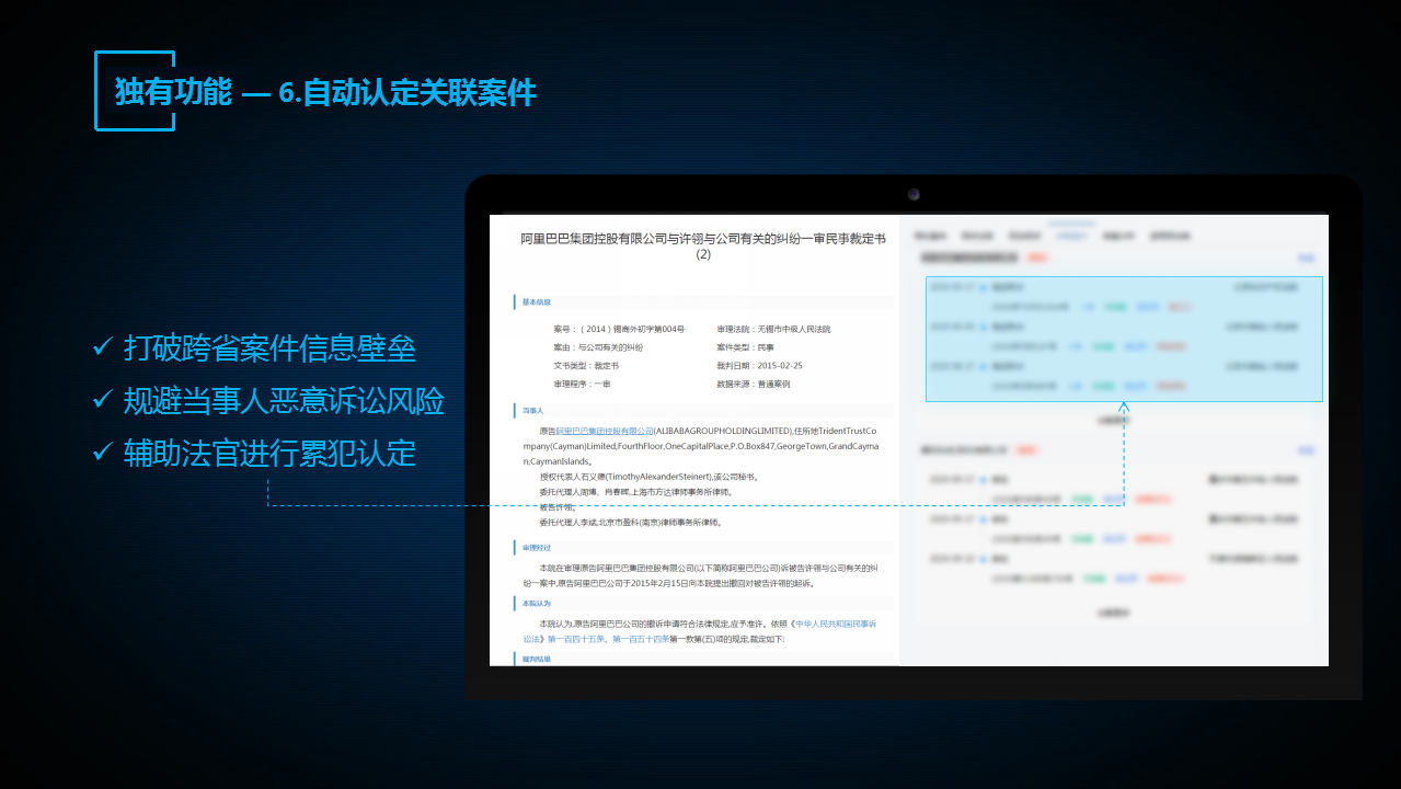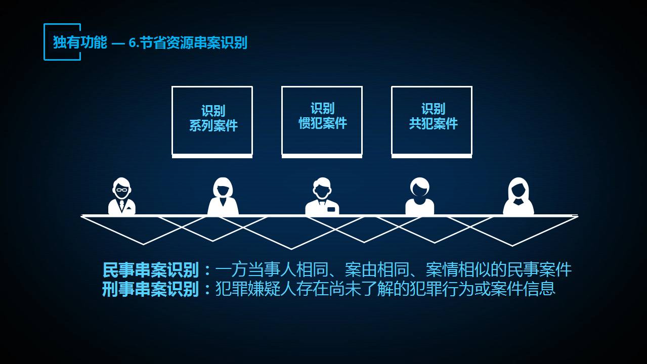 “法信2.0智推系統(tǒng)”的第六個(gè)功能,是基于人民法院大數(shù)據(jù)管理和服務(wù)平臺(tái)的全量案件信息,對(duì)同一當(dāng)事人跨域跨省的多地訴訟案件進(jìn)行自動(dòng)認(rèn)定,從而規(guī)避當(dāng)事人惡意訴訟風(fēng)險(xiǎn),輔助法官進(jìn)行累犯認(rèn)定。