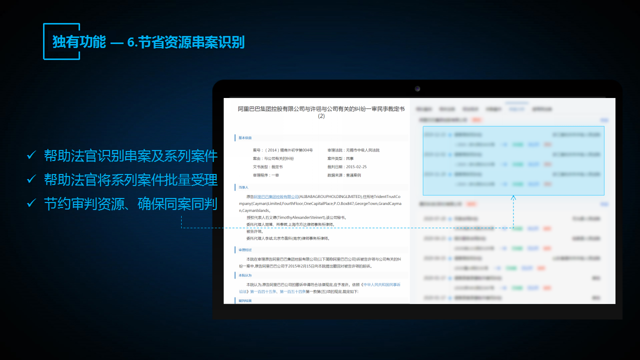 “法信2.0智推系統(tǒng)”還能從法院類案大數(shù)據(jù)信息中快速識(shí)別出民事案件中一方當(dāng)事人相同、案由相同、案情相似的串案和刑事案件中犯罪嫌疑人存在尚未了解的犯罪行為或案件信息。從而快速識(shí)別串案和系列案件,提高系列案件批量受理的效率,節(jié)約審判資源。