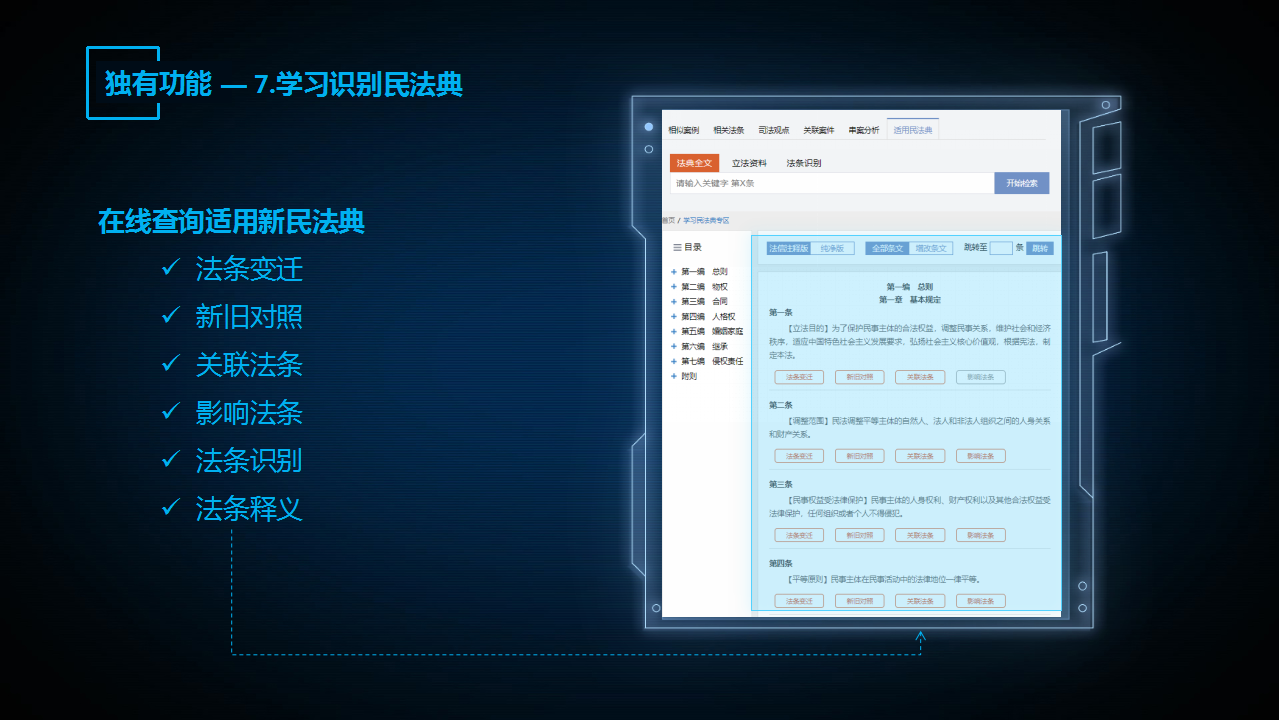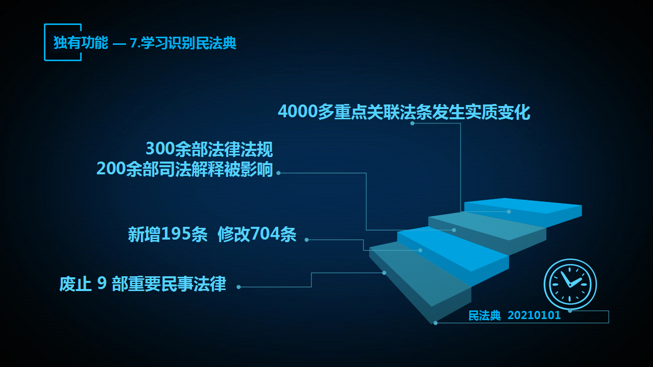 “法信2.0智推系統(tǒng)”的第七個(gè)功能是學(xué)習(xí)識(shí)別民法典功能。民法典即將在2021年1月1日施行,據(jù)不完全統(tǒng)計(jì),至少還有277部法律法規(guī)、219部司法解釋,涉及法官辦案常用近4000條重點(diǎn)關(guān)聯(lián)法條會(huì)受到效力影響和變化。