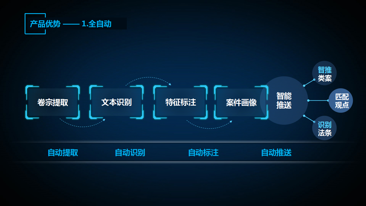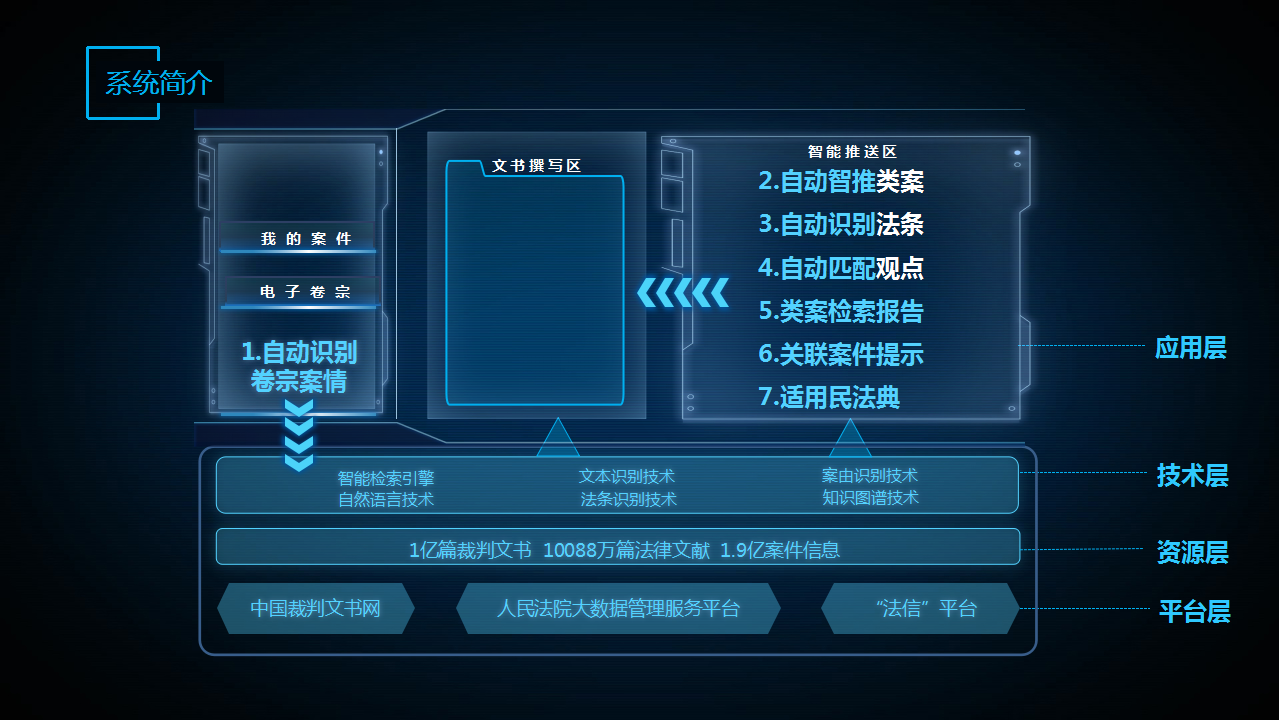 基于此,系統(tǒng)就可以從電子卷宗中各類結(jié)構(gòu)化和半結(jié)構(gòu)化的法律文本里,自動(dòng)提取識(shí)別案情特征,進(jìn)而實(shí)現(xiàn)一案一畫像,一案一推送。