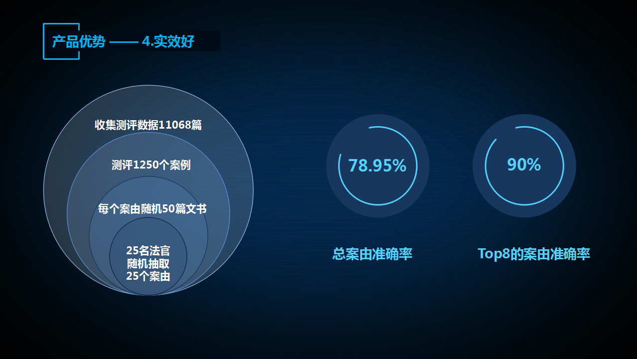 經(jīng)過第三方初步測(cè)評(píng)(組織25名法官對(duì)隨機(jī)抽取的25個(gè)案由、1250個(gè)案例、11068篇文書進(jìn)行了測(cè)評(píng)),準(zhǔn)確推送的文書為8698,整體準(zhǔn)確率為78.59%,其中民事和刑事常用的top8的案由罪名的準(zhǔn)確率均在90%以上。“法信2.0智推系統(tǒng)”在遼寧、蘇州、深圳等地法院部署應(yīng)用,反響良好(參見衍生閱讀)。