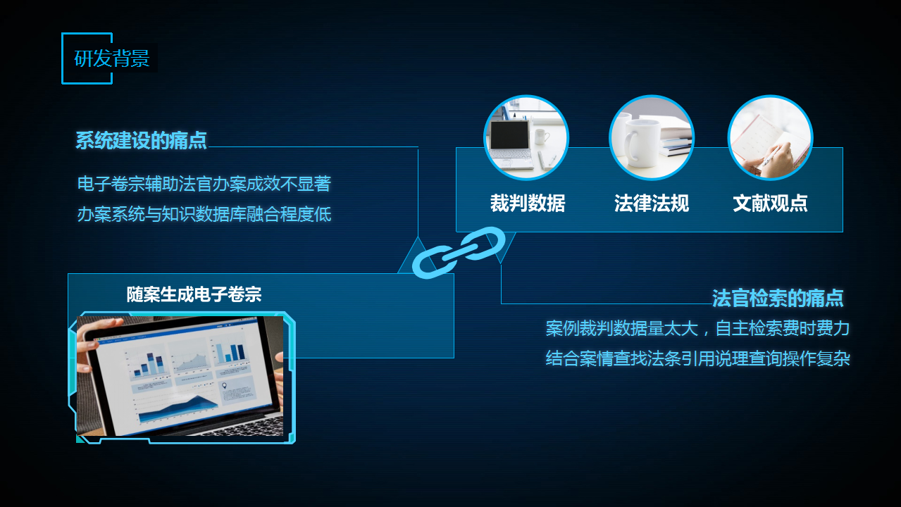 智慧法院建設(shè)過程中,一方面快速聚集了大量能為法官辦案提供知識(shí)服務(wù)的類案、法律、文獻(xiàn)觀點(diǎn)等中臺(tái)數(shù)據(jù);另外一方面隨電子卷宗隨案同步生成工作的推進(jìn),每一個(gè)個(gè)案又形成了豐富的案卷文本信息。但是兩套系統(tǒng)各自獨(dú)立,沒有融合發(fā)揮倍增功效。從法官檢索的角度來看,案例裁判的數(shù)據(jù)量越來越大,投入檢索的時(shí)間精力也越多。從信息化建設(shè)的角度來說,電子卷宗所發(fā)揮的輔助法官辦案的成效不夠顯著。所以將知識(shí)服務(wù)類的數(shù)據(jù)中臺(tái)與辦案卷宗系統(tǒng)的最后一公里打通,讓兩個(gè)系統(tǒng)相融合迫在眉睫。